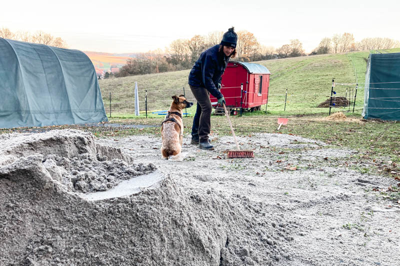Jetzt verhindert der Sand die Rutschgefahr und die Äppel lassen sich viel leichter von den Lochmatten entfernen und kleben, auch im gefrorenen Zustand, nicht mehr daran fest – hurra.