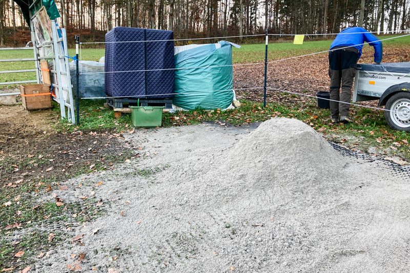 Jetzt verhindert der Sand die Rutschgefahr und die Äppel lassen sich viel leichter von den Lochmatten entfernen und kleben, auch im gefrorenen Zustand, nicht mehr daran fest – hurra.